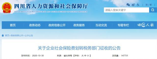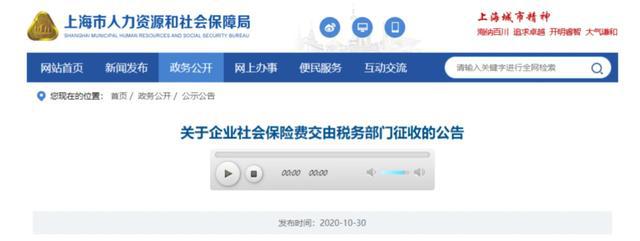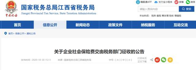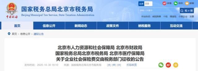 10月30日 北京、上海、山東、山西、湖南、四川、貴州、吉林、江西等地同時(shí)發(fā)布了《關(guān)于企業(yè)社會(huì)保險(xiǎn)費(fèi)交由稅務(wù)部門(mén)征收的公告》的通知。
