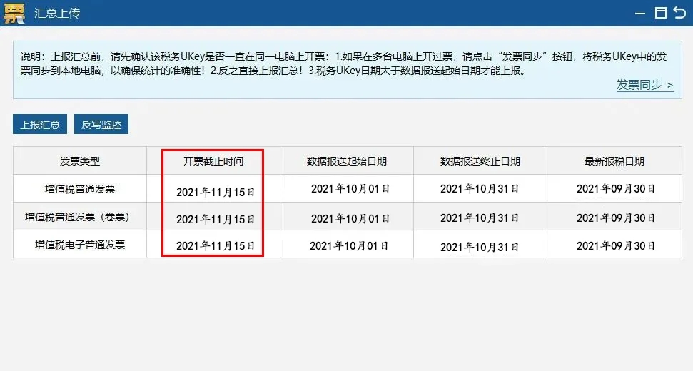 需核對開票截止日期是否更新到2021年11月15日左右。若自動抄報未成功,或開票截止日期未更新,可參照以下步驟進行抄報。